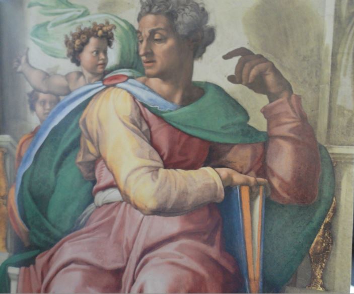 En todo caso, me parece que, además de las interpretaciones estructurales o técnicas mencionadas, hay una constante «temática» que encuentro en esos verdes en la bóveda. Por un lado están las figuras de los lunetos y de los triángulos sobrestantes, de las pechinas de los cuatro ángulos y de las figuras de los profetas y de las sibilas, donde el verde es uno de los colores principales en los ropajes.
