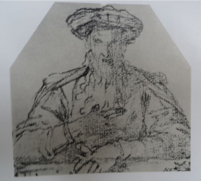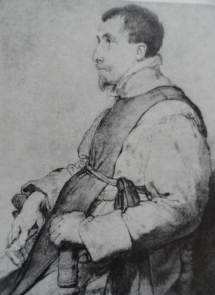 Autorretrato. Pincel y tinta marrón, realzado en blanco sobre esbozo en piedra negra. Joachim von Sandrart. s.XVII. Hermitage.
