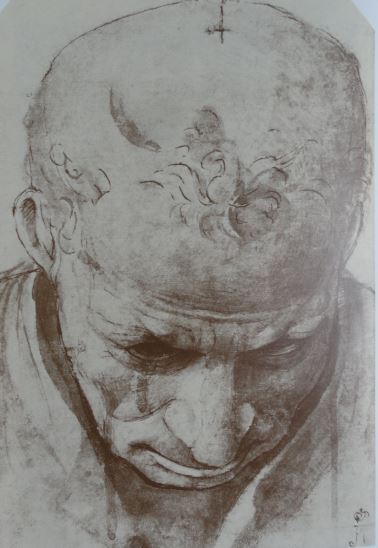 Cuando un maestro de la escuela manierista italiana empuña las tizas o pasteles secos para sus estudios preparatorios de cuadros religiosos y se plantea la expresión del santo, el rey mago o el apóstol estático la vejez se convierte en cercanía de la gloria y de la salvación eterna. La clara mirada azul se dirige al cielo.