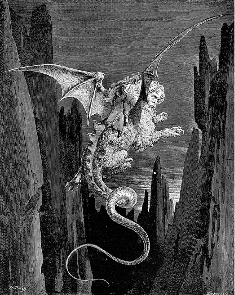 Para llegar ahí, al séptimo círculo infernal, Dante y Virgilio han tenido que volar sobre una enorme sima a lomos del dragón Gerión, un monstruo mitológico del que habla la Eneida. Si bien Dante se aleja un poco de la descripción del mito, para darle forma tri-corpórea (hombre, serpiente y escorpión), en parte parecido a la langosta del Apocalipsis de San Juan (IX, 7-11).
