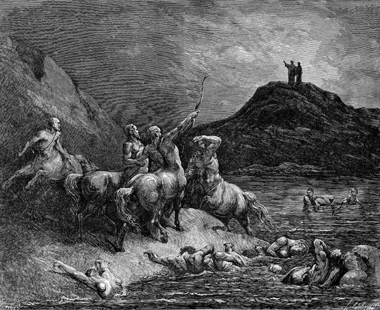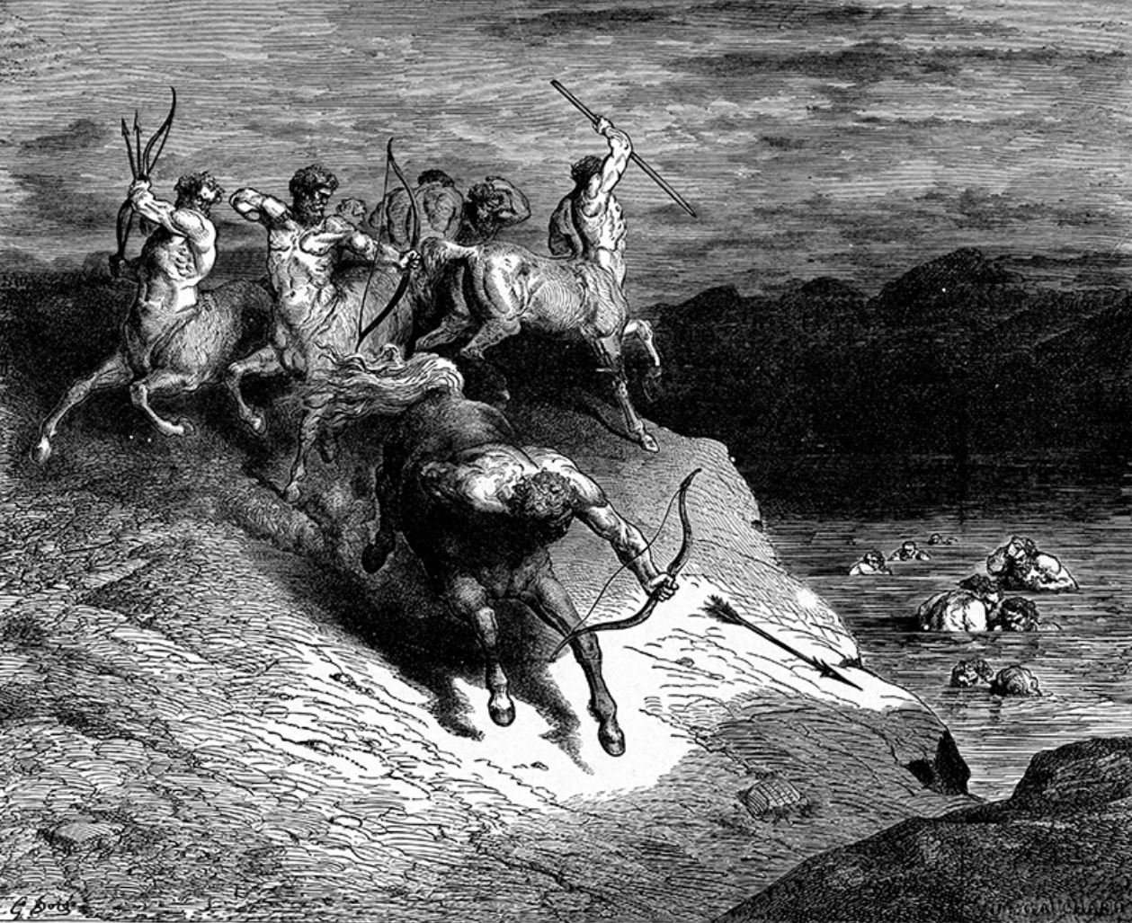 Un centauro les interpela a gritos, amenazándoles que si no explican su derecho a venir a este lugar les atacarán. A lo que Virgilio replica que Quirón, el centauro jefe de la tropa, sabe bien a qué han venido.