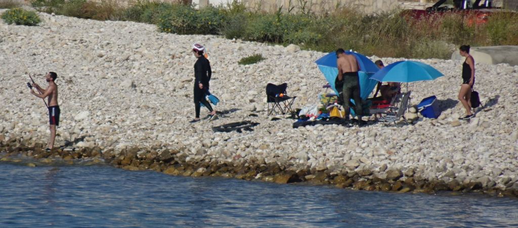 Otros se acomodan sobre las piedras de modos varios, se visten de neopreno para bucear o hacen como que pescan…