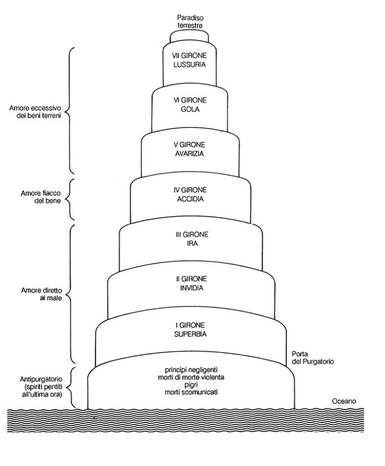 Una vez superada la puerta de entrada, la subida comienza por las tres primeras cornisas, las destinadas a quienes se movieron «por amor del mal» : I Soberbia, II Envidia, III Ira. Entremedias se haya la cornisa destinada a quienes fueron «flojos en amar el bien» : IV Pereza. Y, por último, las tres cornisas superiores, ya en la cercanía del Paraíso, las del «amor excesivo de los bienes terrestres»: V Avaricia, VI Gula y VII Lujuria. Si los pecados más graves son los inferiores del ascenso por el Purgatorio, pues están más cercanos al Infierno, habrá que suponer que los más cercanos al Paraíso son los más discupables.