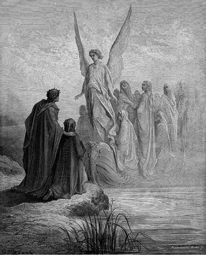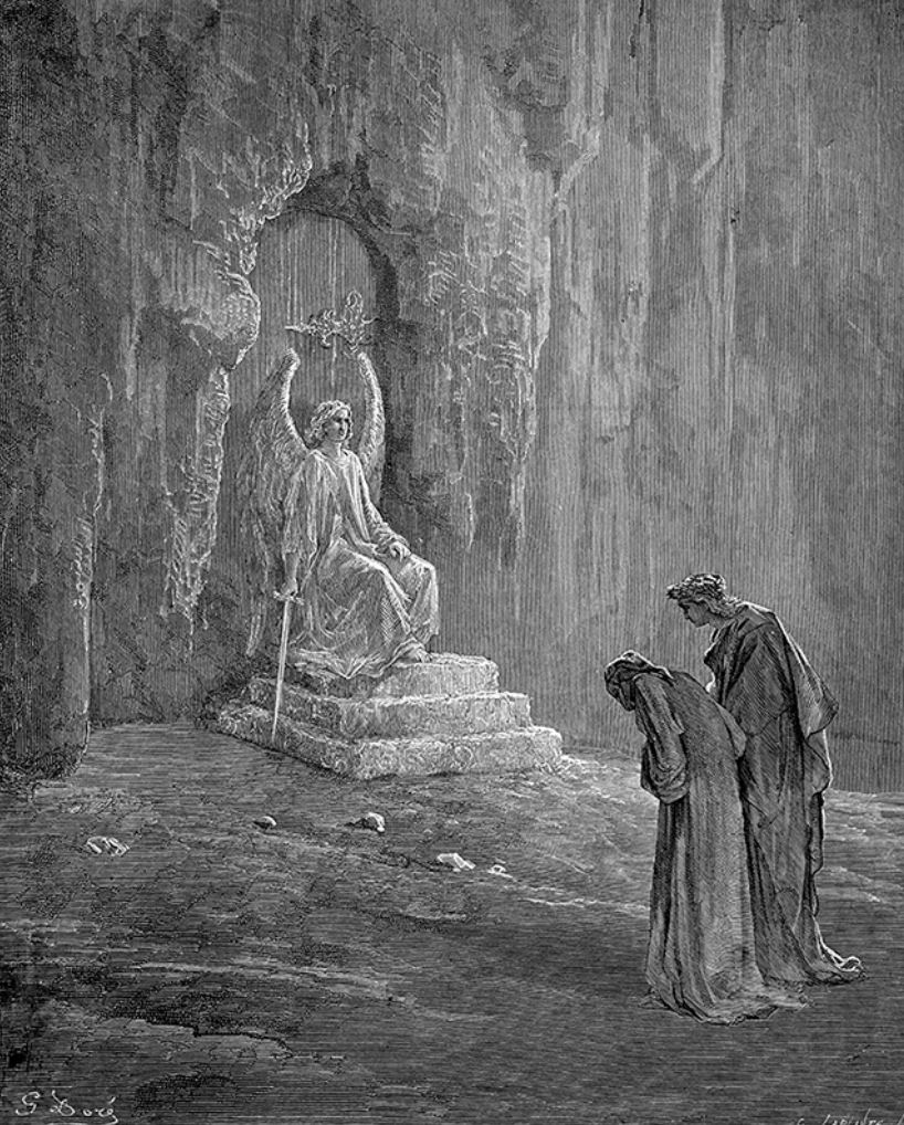Por hoy, dejaremos a nuestros dos poetas ascendiendo por un escalinata hacia la segunda cornisa del Purgatorio, no sin que antes un ángel haya borrado de la frente de Dante la primera P, la del pecado de soberbia: