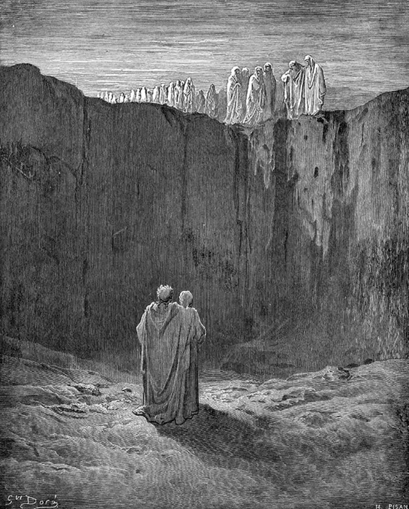 Pero volvamos a ver a los dos poetas, ahora plantados ante un ríspido acantilado. Mientras Virgilio mira con cuidado donde poner sus pasos, Dante, que está buscando una forma de rodear el obstáculo, descubre una muchedumbre de espíritus que se acerca a ellos lentamente.