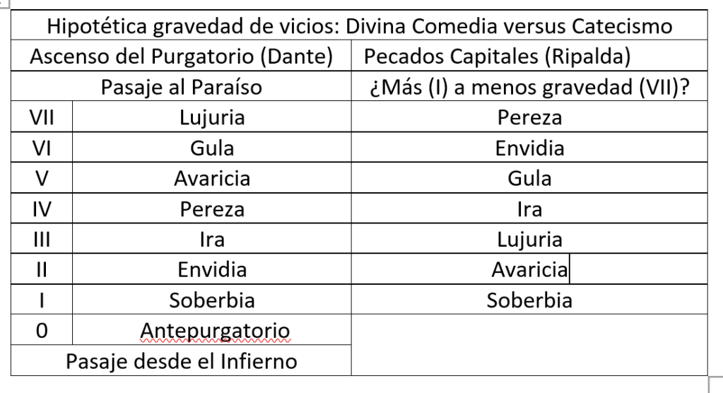 Para Dante parece que la Lujuria estuviese lejos de los niveles de la condena eterna del Infierno, mientras que en aquel catecismo sólo la preceden la Soberbia y la Avaricia. También la Gula parece menos grave en Dante. Y la Pereza sería el menor agravante para Ripalda.