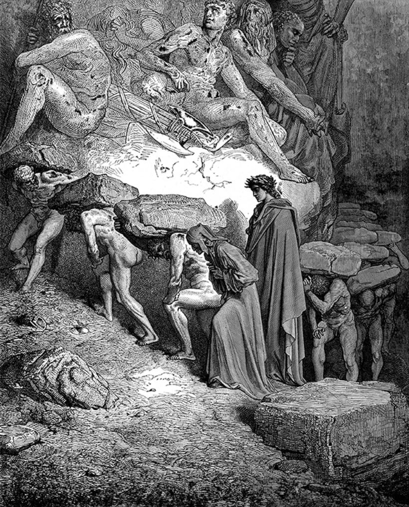 Con todo y con eso, el recorrido de las cornisas de esa especie de zigurat le da ideas a Doré para llenar de castigados cada «circuito» (girone) de los siete que lo componen; un paseo que Dante, guiado por Virgilio, completará antes de llegar al Paraíso.