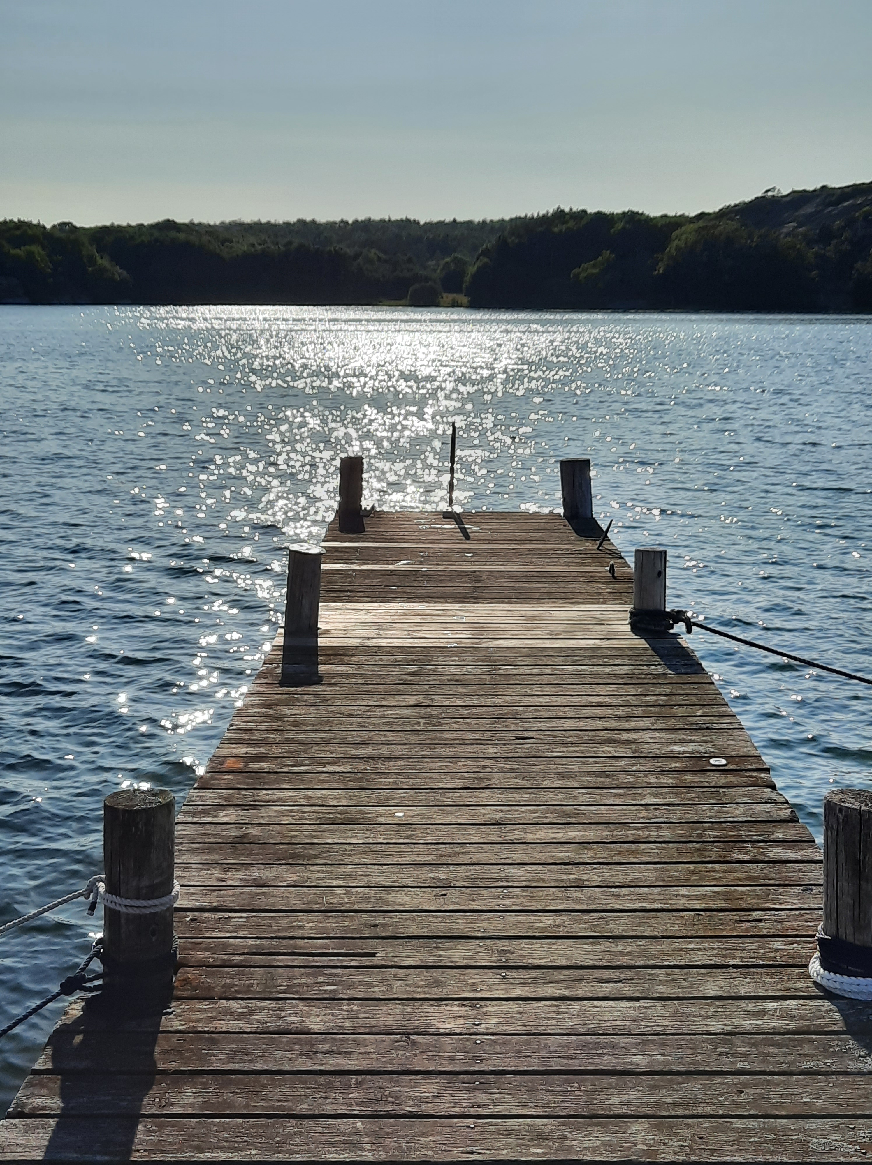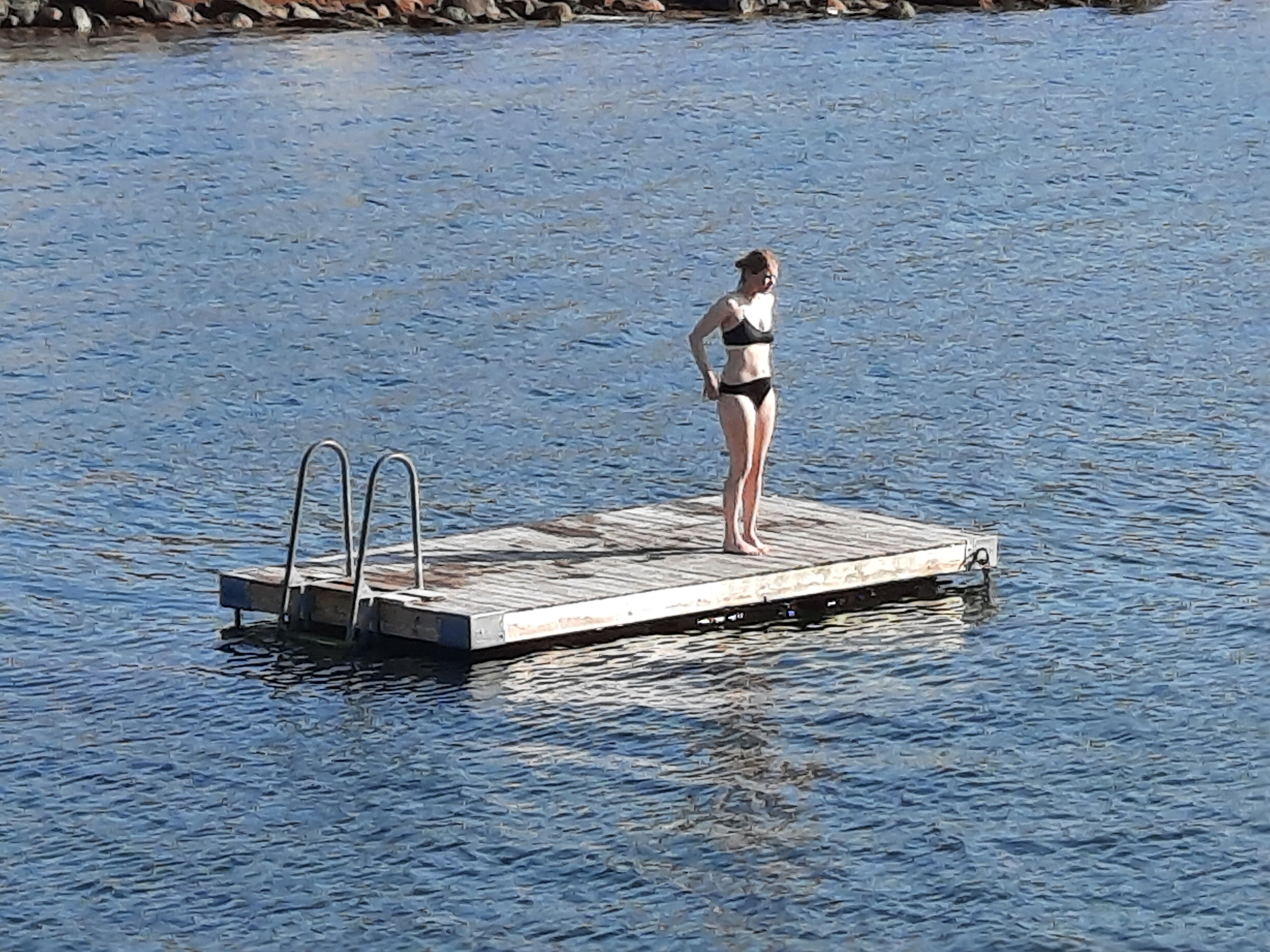 Por nuestra parte, además de sentarnos en la terraza de la heladería a disfrutar de un bollo, un helado y un café, también pudimos refrigerarnos con un par de zambullidas en las aguas de dos de sus lugares de baño, en el puertecillo de Rörvik, situado ante el brazo de mar en tierra firme…