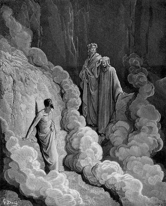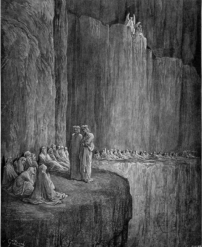 Por hoy, dejaremos a Virgilio y Dante en su ascenso hacia la cuarta cornisa del Purgatorio, algunos de cuyos detalles ilustrarán de nuevo a modo de ékfrasis los grabados de Gustavo Doré en posterior etapa.