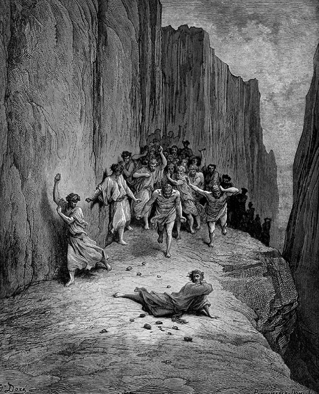 Dante y Virgilio se pasean ya por la segunda cornisa del Purgatorio donde los justos purgan sus envidias para poder llegar al Paraíso. Es difícil distinguir las sombras de las ánimas del pálido color de la piedra contra la cual están apoyados unos junto a otros con los párpados cosidos para purgar así la excesiva atención de la vida ajena que en vida les carcomió.