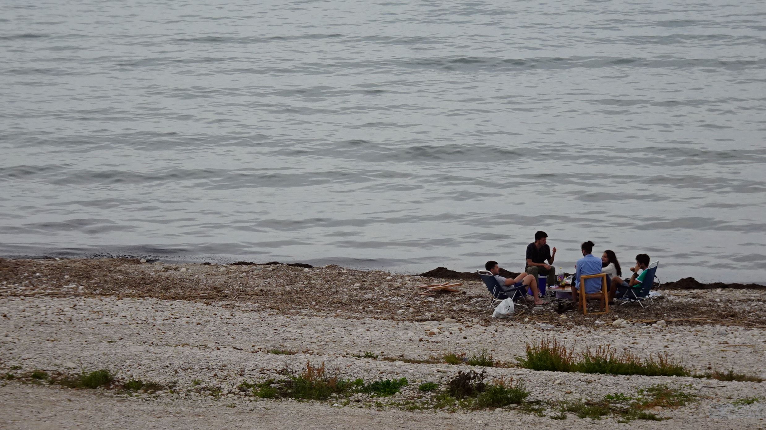 sentados en la orilla.