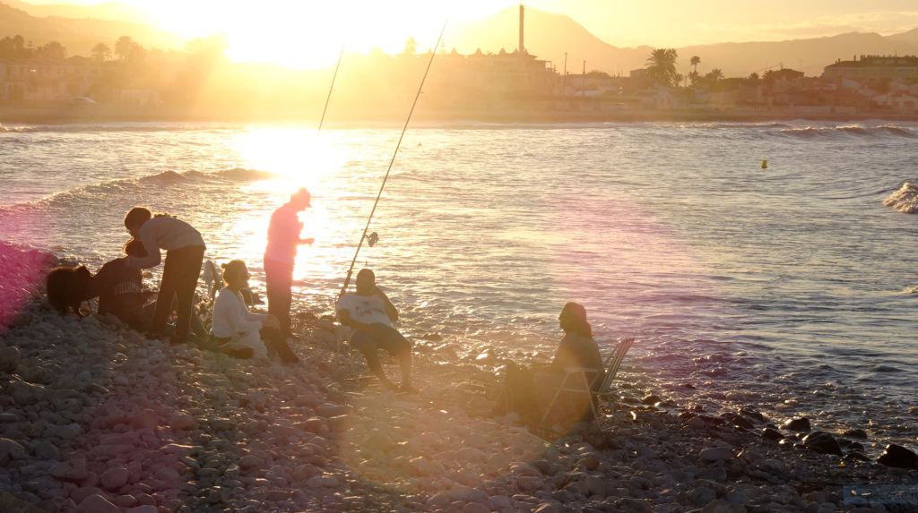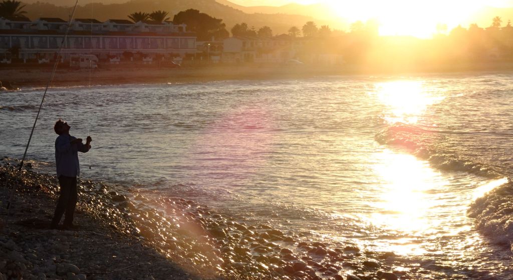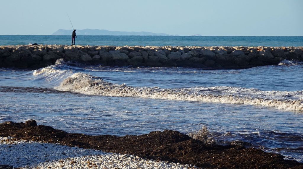 Sobre el espigón hay quien pesca o lo intenta. Al fondo se aprecia el promontorio de Cullera.