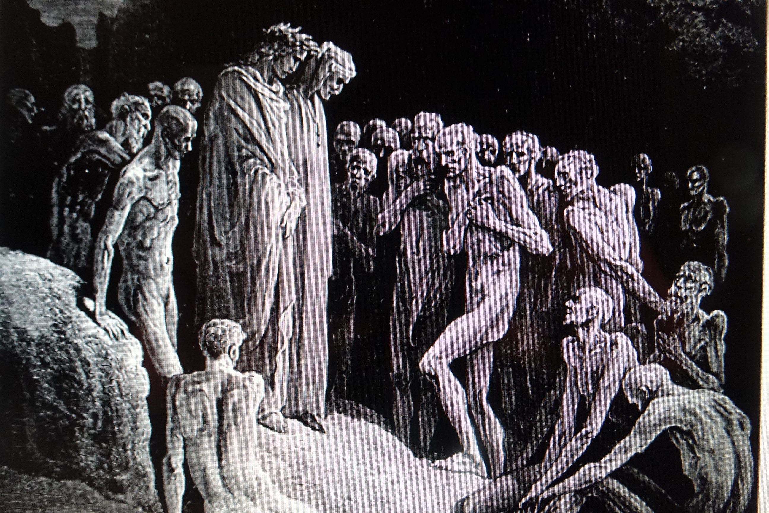 Los peregrinos no salen de sus asombro al ver que, reducidos a esqueleto y piel, braman purgando su gula esas ánimas del Purgatorio, excitadísimas al simple aroma de las manzanas.