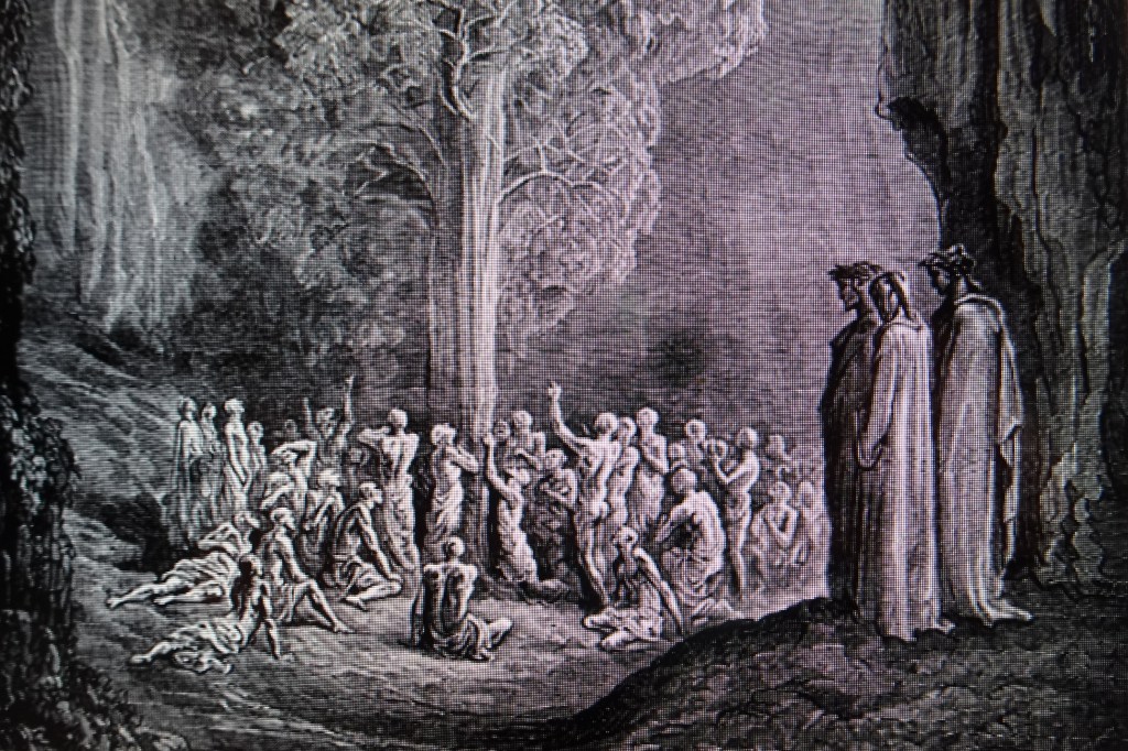 Habíamos dejado a Dante y a Virgilio en medio de una turba de avarientos que en el purgatorio purgan su avaricia con el creativo castigo de estar pegados a la tierra cuyos bienes tanto ambicionaron. Pero cuando se avecinan las fiestas navideñas es casualidad que cuatro cantos más adelante los versos de Alighieri y los grabados de Doré nos prevengan contra el vicio característico de estas fechas : la glotonería.