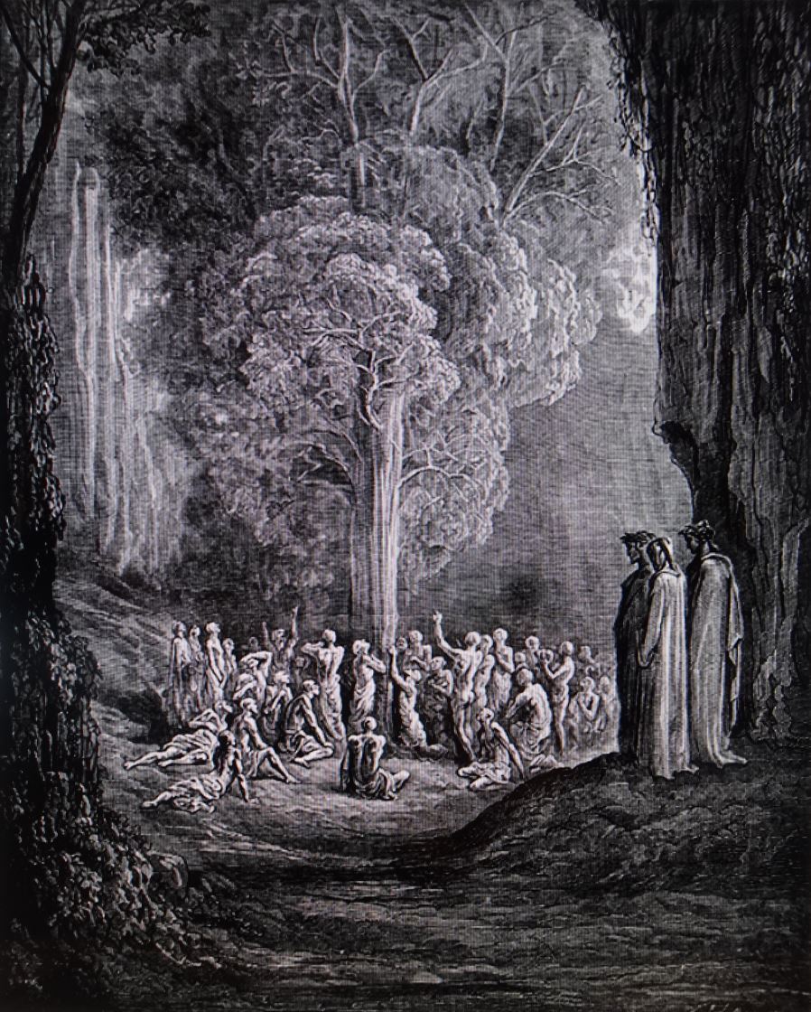 De modo que es él quien le explica el extraño fenómeno que a las almas glotonas hace quedarse en el puro pellejo, al aspirar el aroma del árbol de las manzanas y contemplar el verdor que por su fronda asciende.