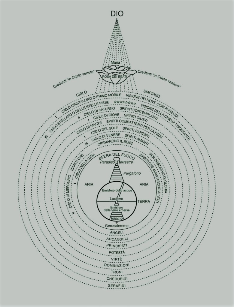 Abandonando la esfera del fuego que engloba el Infierno y el Purgatorio, se progresa por el Paraíso siguiendo las órbitas de los planetas del sistema solar, aunque empezando por nuestro satélite, la Luna. Por ellas se reparten las varias jerarquías angélicas y, según una escala de méritos, residen las almas beatas.