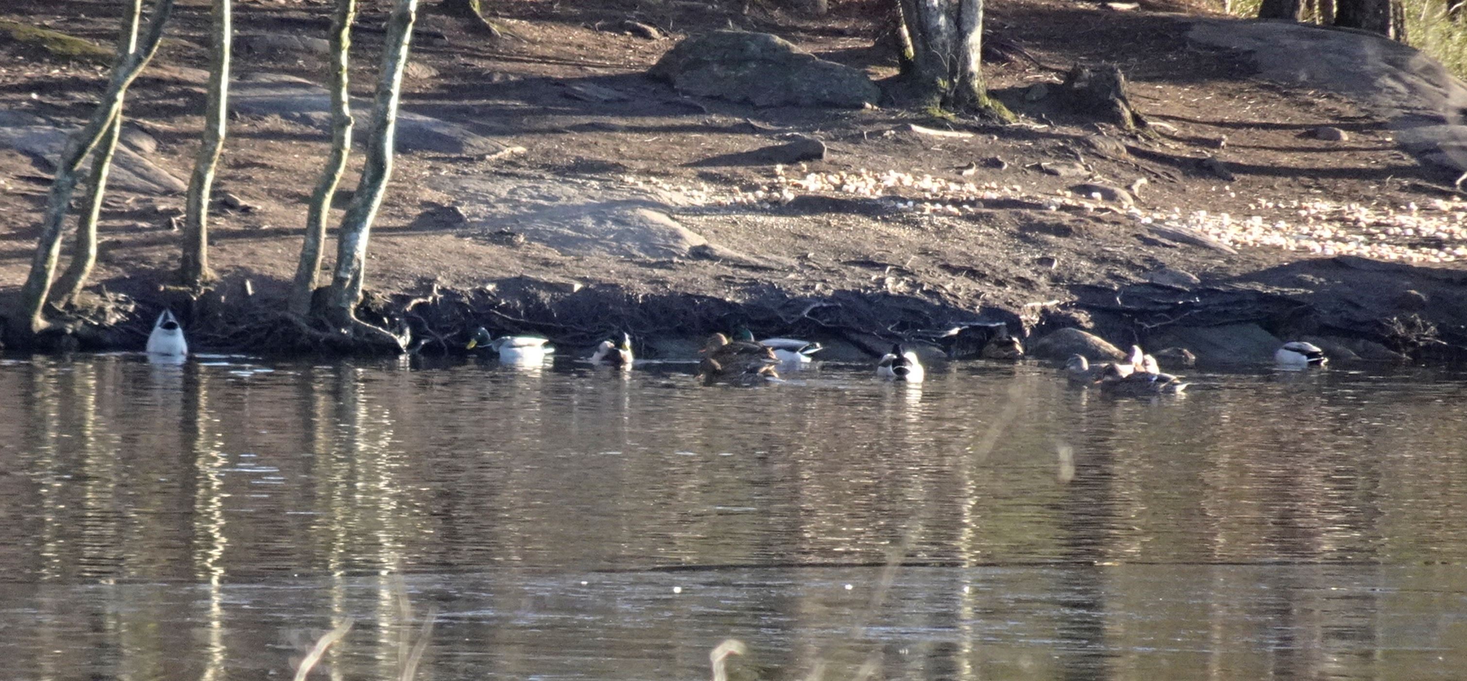 El agua está cubierta de placas de hielo, lo que no disuade a los patos y las patas de sus flirteos en la orilla de enfrente.