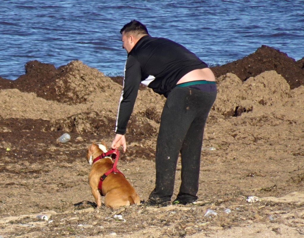 mientras había quien intentaba controlar a su perro frente a otro sector de la playa lleno con depósitos de posidonia arrancada por los temporales de este mes de marzo.