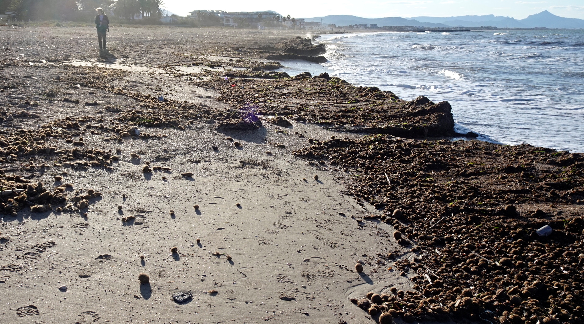 mientras había quien intentaba controlar a su perro frente a otro sector de la playa lleno con depósitos de posidonia arrancada por los temporales de este mes de marzo.