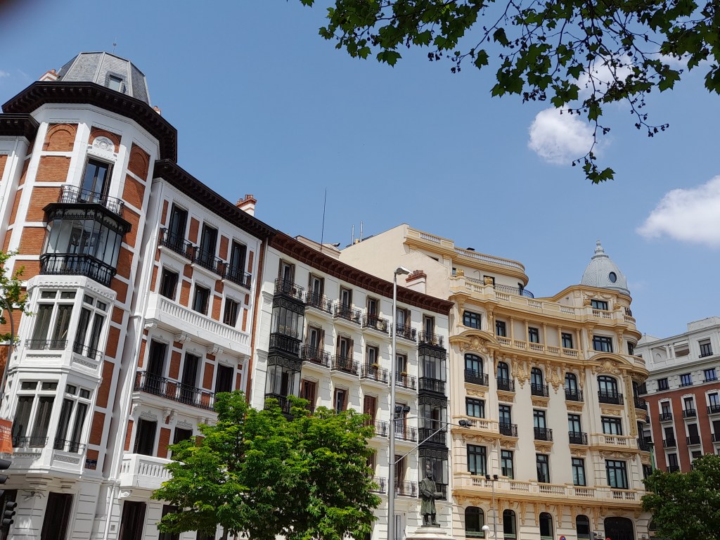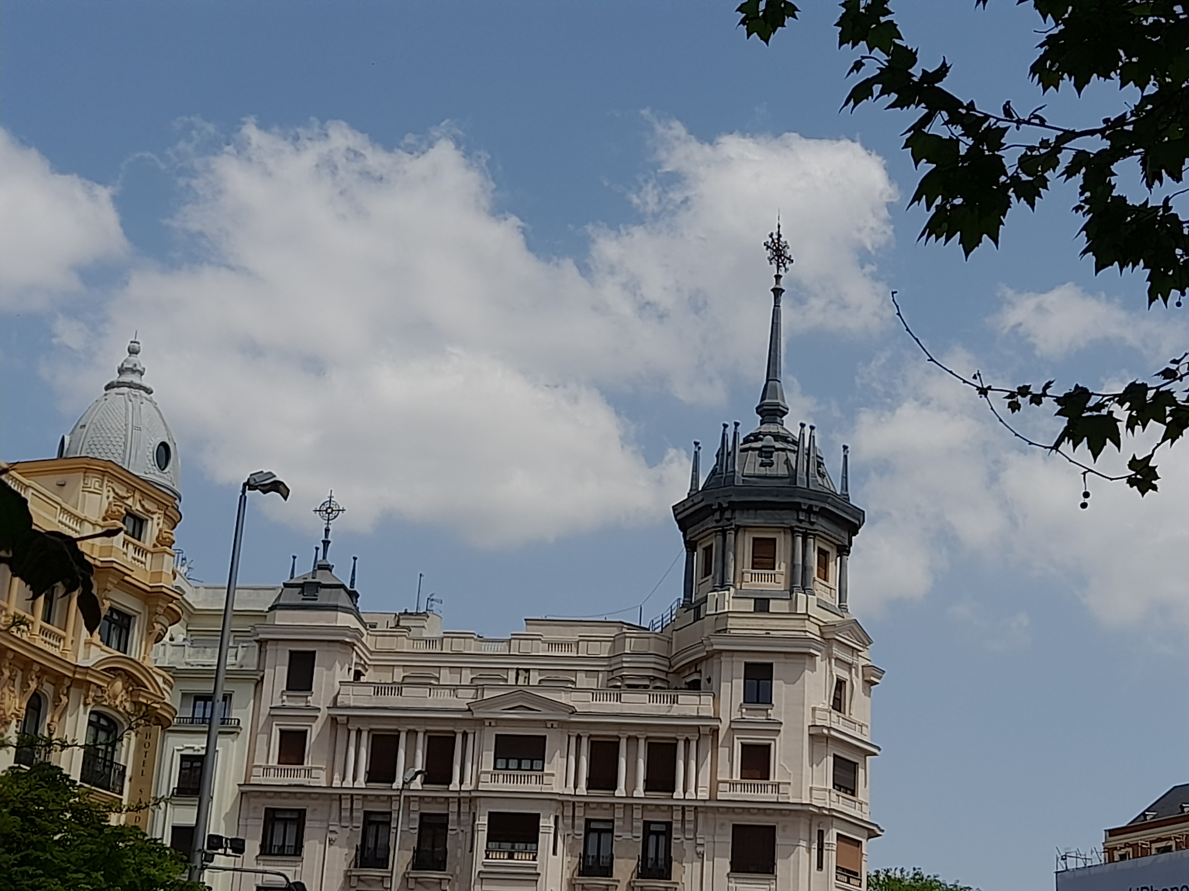Volviendo al azul, les obsequio con algún retazo del cielo madrileño, sobre la plaza de Alonso Martínez, cuando la lluvia decidió darnos un descanso.