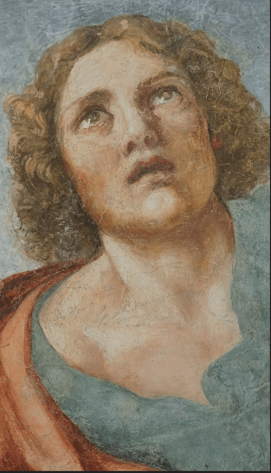 Francesco Albani 1604 – 1605. San Juan Evangelista. Detalle de «Los apóstoles alrededor del sepulcro vacío de la Virgen». Museo de Arte de Cataluña, exposición en el Museo Nacional del Prado de Madrid.
