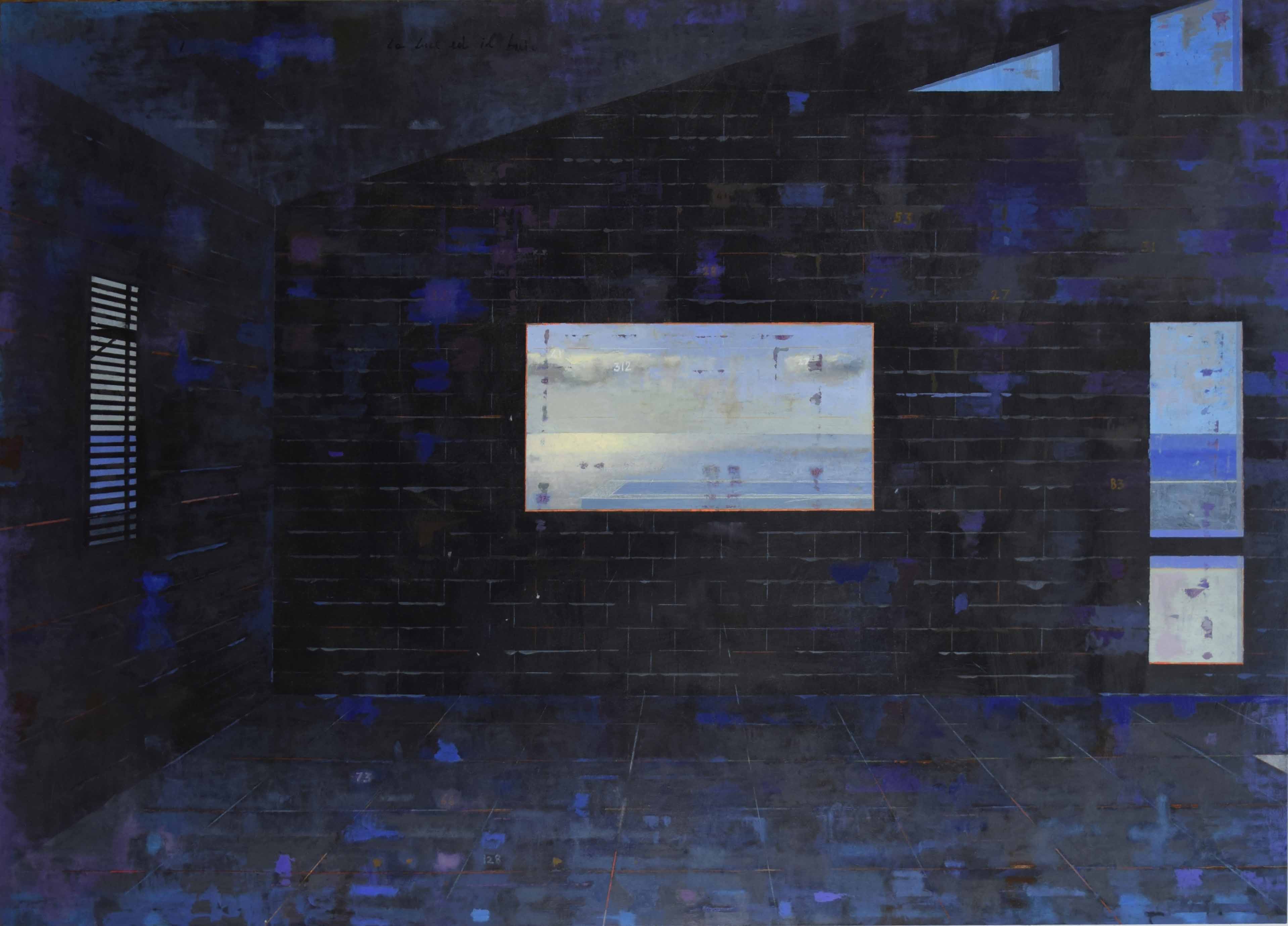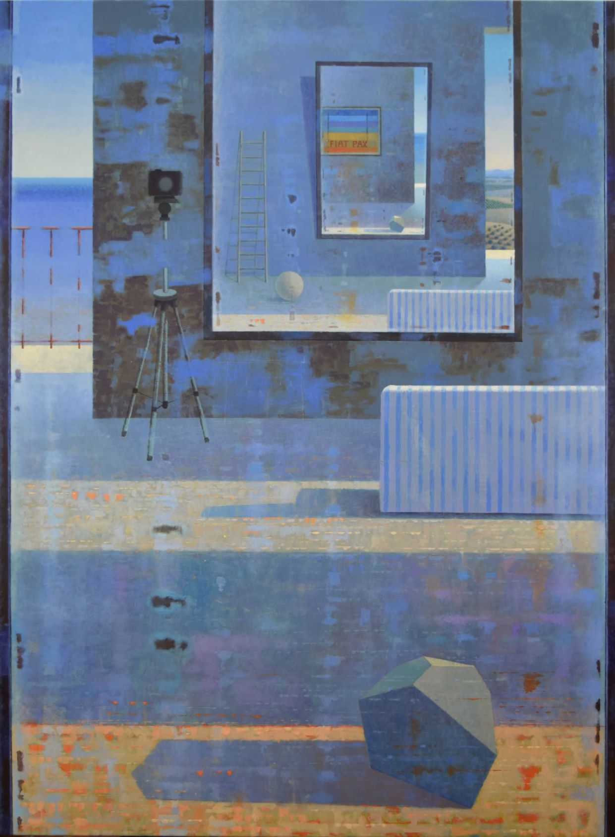 Al fondo de una galería de espejos el deseo de vivir en paz se aleja fugitivo. En primer plano el poliedro inspirado por la Melancolía de Durero y, tras los muros que nos alejan de la Paz, el azul del mar y los campos natales del pintor. El horizonte en calma de una memoria primigenia figura una época añorada que la voluntad violenta, la malignidad de unos pocos, arrebata desde siempre a las inmensas mayorías.