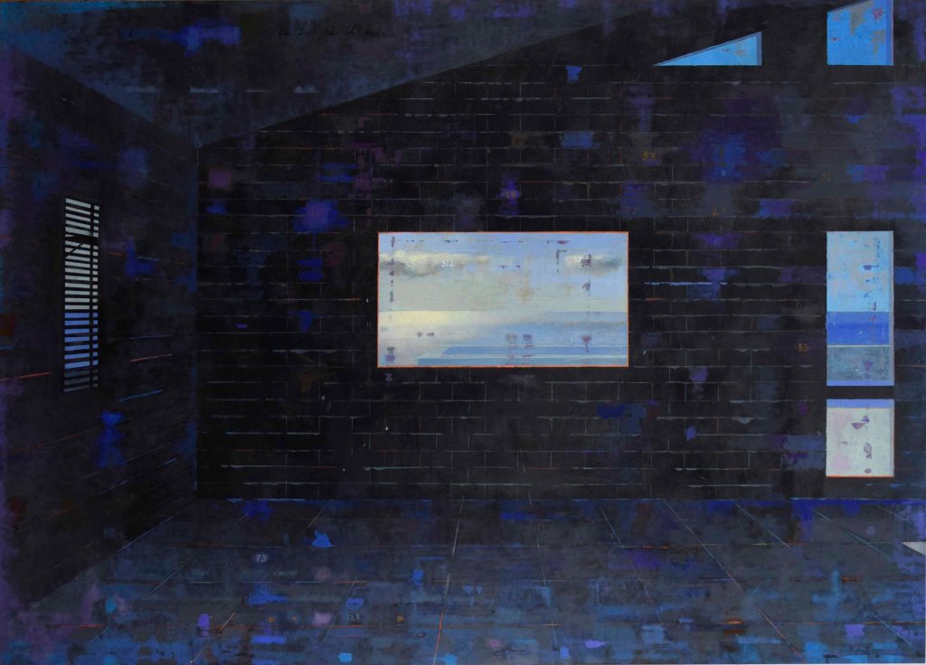 Esta es la única obra del pintor, entre las que aparecen en su página web, y que en particular me ha señalado para el blog, en la cual el negro es el protagonista a contraluz. Es un cuadro en el que el pintor por excelencia de la luz mediterránea, en cuyos obras la oscuridad queda siempre restringida a una estancia que se atisba a través de una puerta o al pasaje de un túnel, pero sólo como tránsito hacia la luz del mar, del paisaje o del cielo, el solo cuadro en que la oscuridad embarga el cuadro, y la luz queda circunscrita. Se trata de una cámara oscura, de una estancia agrandada similar a aquellas cajas que Caravaggio o Vermeer dicen que utilizaban para capturar la escena. ¿Es el mar que se percibe en los espacios geométricos del atelier negro de Módica el resultado de una proyección que quiere romper el encierro de este recinto enladrillado de negro? ¿Corresponde este cuadro inhabitual a una meditación en tiempos difíciles?