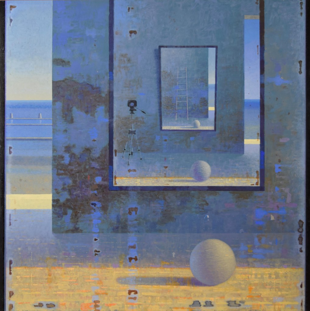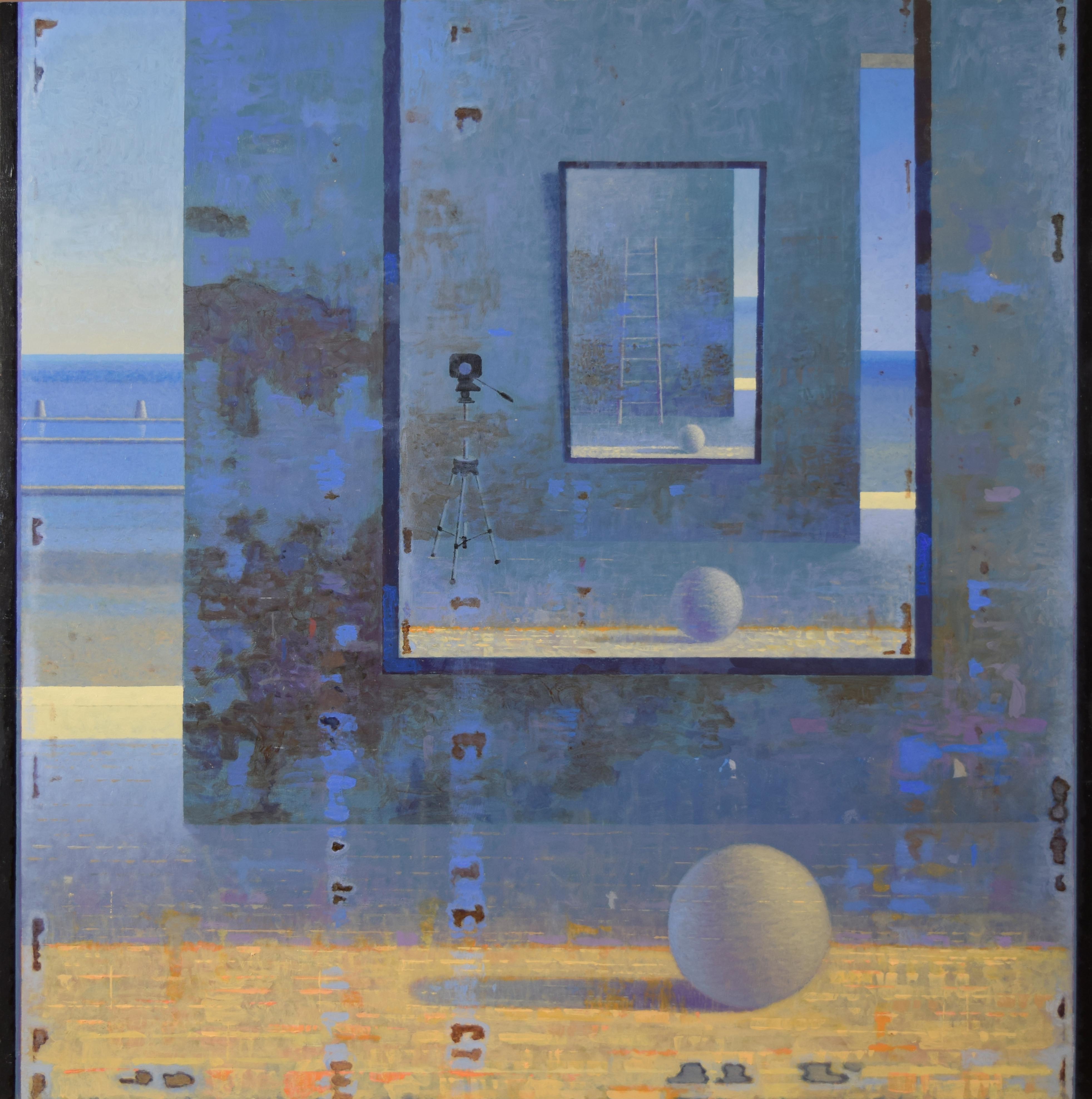 Concluiré fijándome en un lienzo del año pasado en el que reafirma y renueva su constante meditación sobre el espacio y sus ilusiones especulares, recorriendo los territorios del sueño donde pasamos de un plano de la realidad a otro. Ya no es el poliedro de la melancolía de Durero el que se repite en este lienzo sino la esfera, la forma que Parménides (504 – 450 a.C.) consideraba la representación del Ser, perfecto como una esfera, igual en todas sus direcciones a partir del centro.