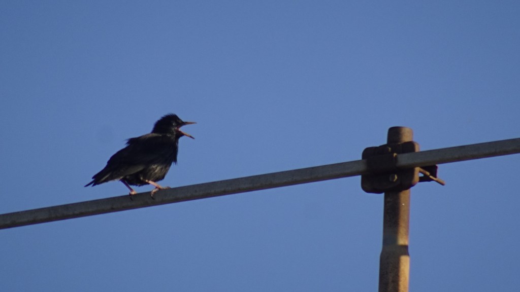 Un grajo pendenciero, o simplemente un madrugador que llama a su pareja, toma posiciones en una antena frente a mi terraza.