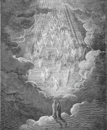 Así imaginó Gustavo Doré la visión de Dante, inspirado quizás por San Buenaventura, y éste a su vez por Jacob, el patriarca bíblico. ¡Sucesión que forma también una escala temporal de algunos milenios!