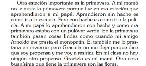 He pensado acabar esta entrada con otra primavera y otros niños, en cuyas mentes esta estación de salida del invierno suena con diversas notas. Habla Beatriz, la hija de Graciela en «Primavera con una esquina rota» de Mario Benedetti (Editorial Sudamericana, Buenos Aires, 1982, pág. 23):