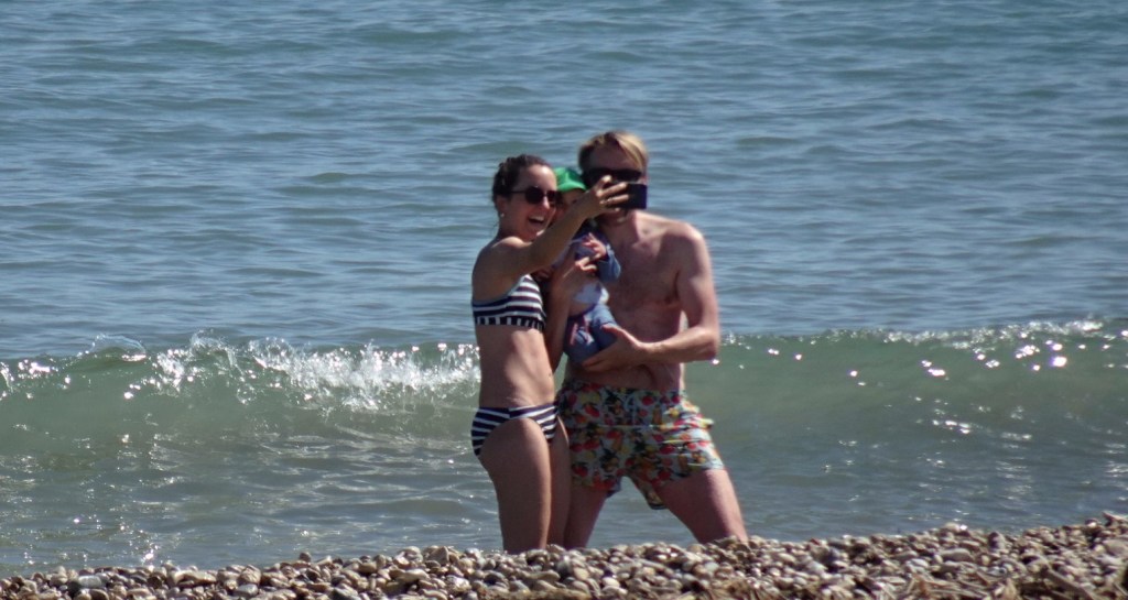 Mamá, bebé y papá el 27 de mayo del 2020 en la orilla del Mediterráneo. Foto R. Puig
