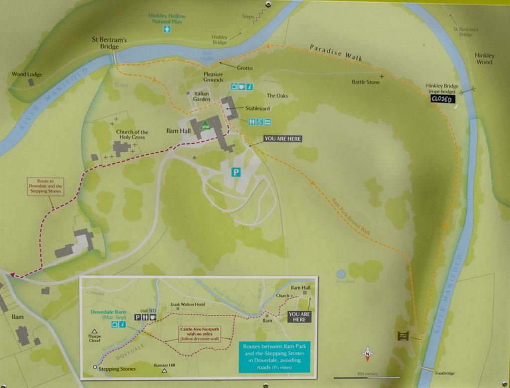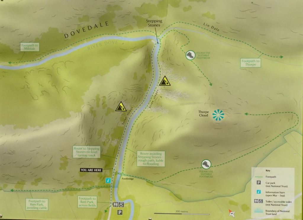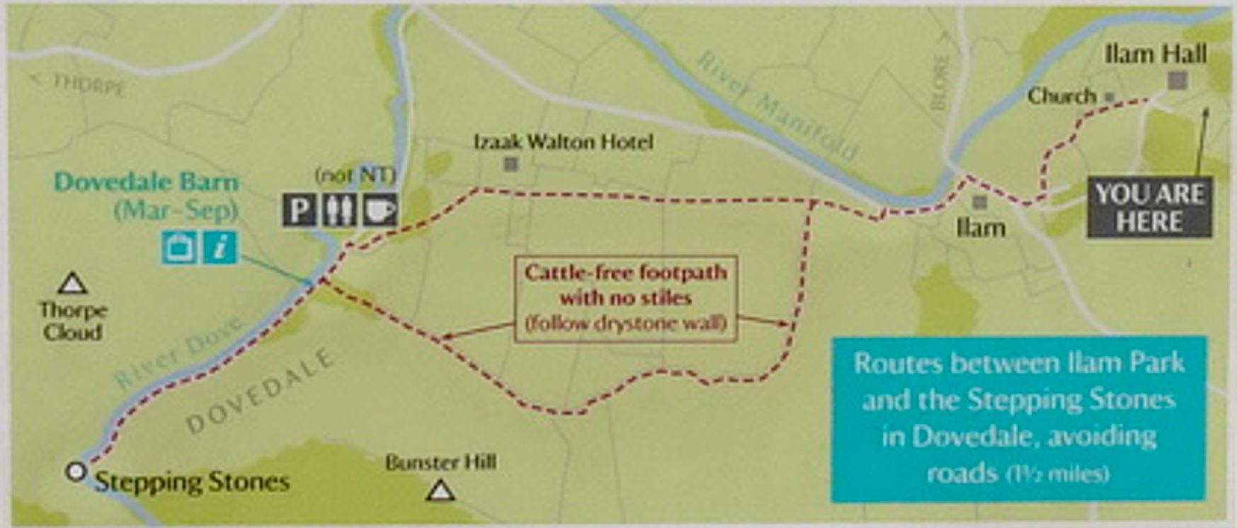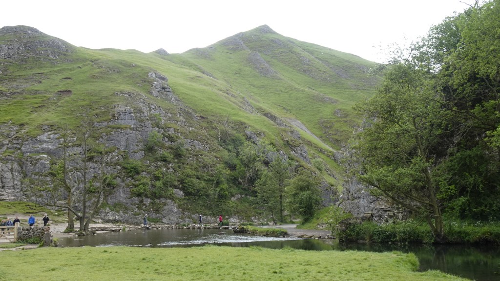 Hay dos opciones para seguir el río Dover desde la entrada de Dovedale : una plácida y llana junto a la margen derecha del río hasta las los stepping stones -piedras planas que te permiten cruzarlo, procurando no resbalar- bajo la cumbre del Thorpe Cloud (287 metros)