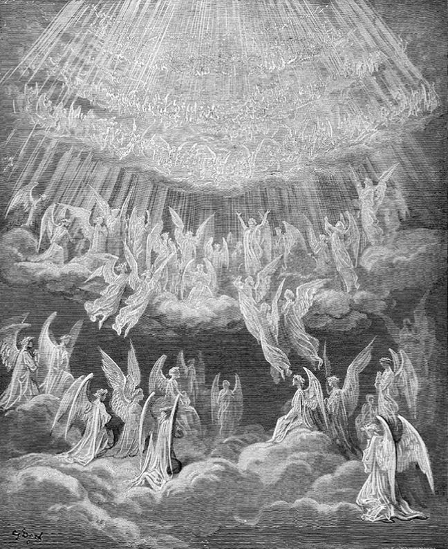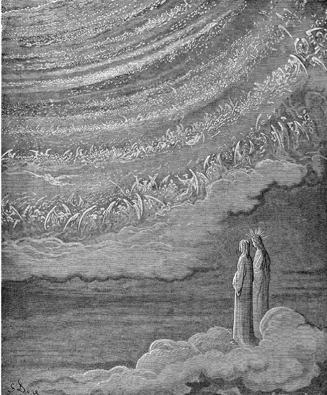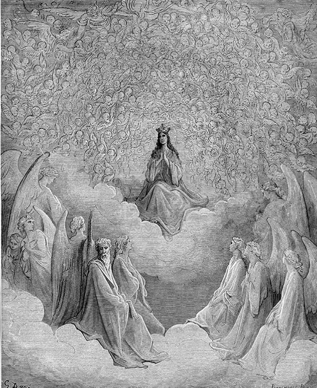 La última ilustración de Doré en el centro de innumerables ángeles, es la visión que San Bernardo le invita a Dante a contemplar, es la de María en el círculo noveno. En esta imagen el artista ha dibujado, no al poeta sino al «Doctor Melifluo» que está mirando con afecto al poeta que está fuera ya de esas alturas.