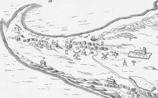 Para completar los datos geográficos, añadamos un plano del lugar tal como era ya en la Edad Media, un puerto pesquero próspero y una enclave comercial para los navegantes de Holanda y Alemania.