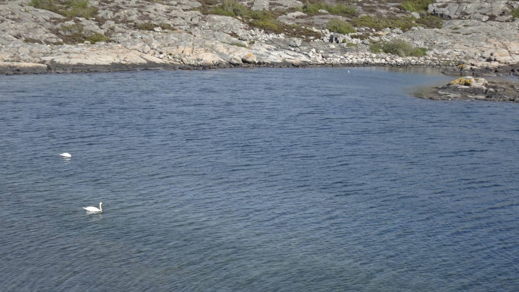 Cuando llegamos al promontorio nos sorprende la vista de una pareja de cisnes deslizándose y buscando pitanza en la calma del Ottervik, la ensenada siguiente en nuestro paseo.