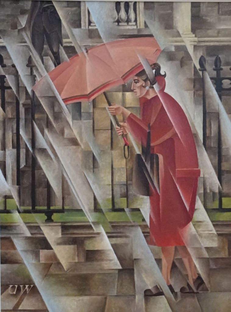o este otro cuadro de Una Watters. Inspirada por el cubismo y el futurismo logra representar la marcha cuidadosa de una joven bajo la lluvia, procurando no mojarse bajo el chaparrón.