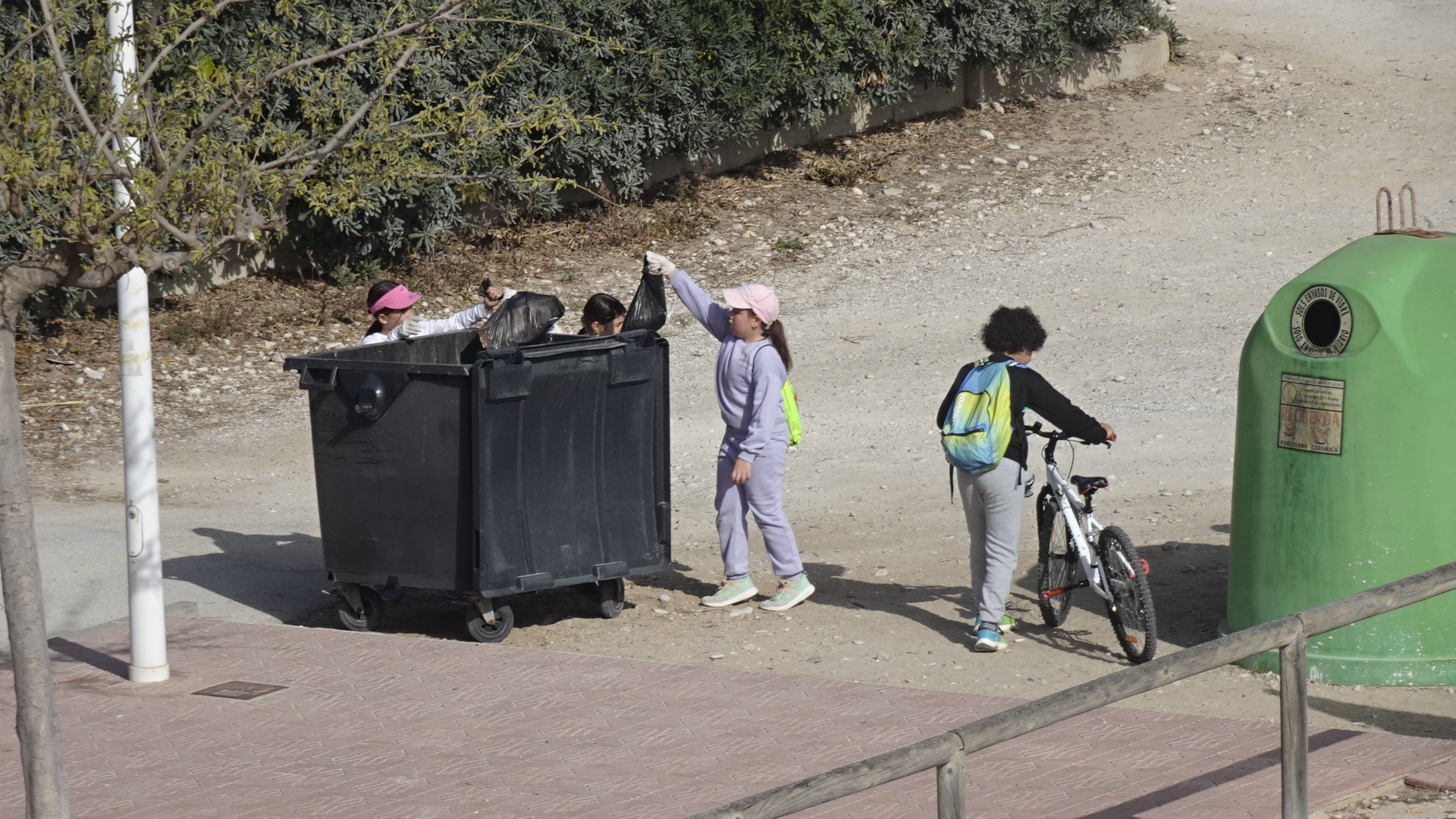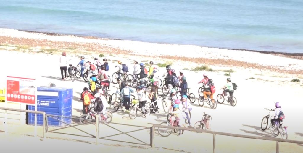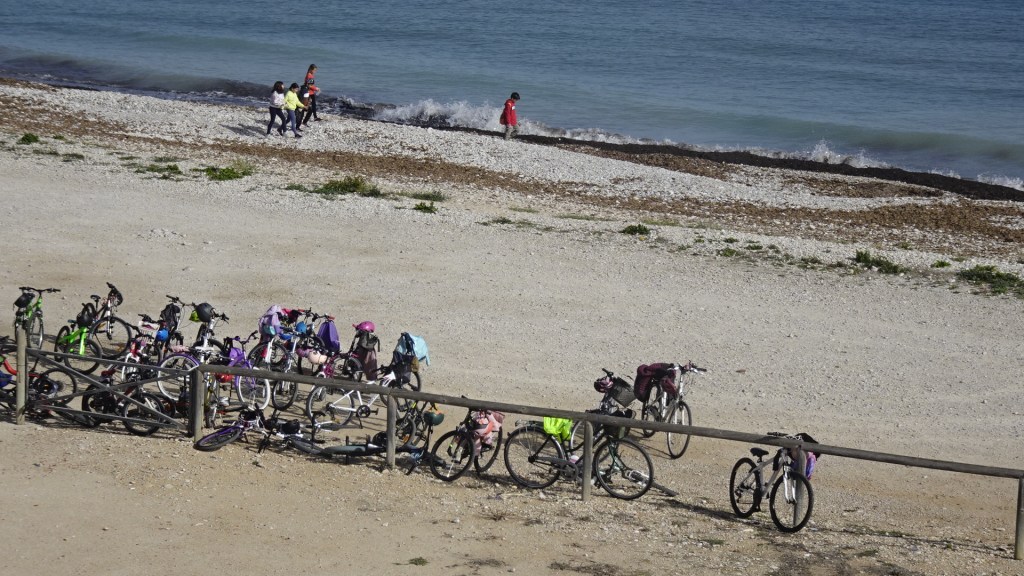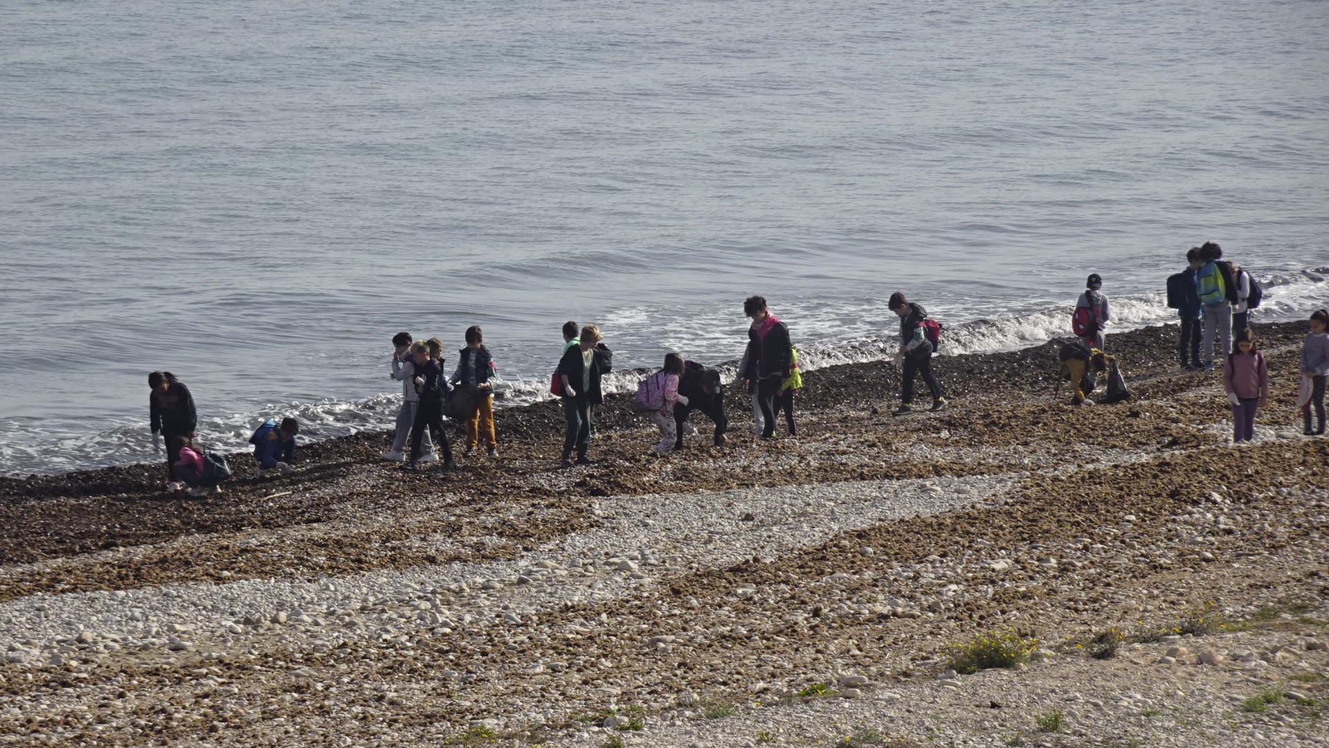 Un grupo nutrido de escolares acompañados de cuatro educadoras han llegado en bicicleta provistos de bolsas de basura para contribuir alegremente a limpiar la playa de detritos, al tiempo que descubrían alguna que otra concha entre los cantos rodados.