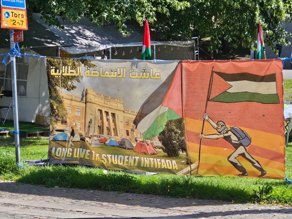 puede que siguiendo nuestro paseo, a diez escasos minutos, sintamos el contraste entre ese parque y la intifada de tiendas de campaña (regularmente vacías), que llevan ya semanas instaladas frente al edificio central de la Universidad, bajo las mismas banderas que muchos palestinos acogidos en Suecia enarbolaron con júbilo frente al ayuntamiento en la plaza de Gustaf Adolf durante las horas que siguieron a la matanza y las violaciones de cientos de pacíficos ciudadanos de Israel, perpetrada por Hamas el 7 de octubre del año pasado, celebrando (como de ello fui testigo) la hazaña homicida y el secuestro de decenas de niños, mujeres, adultos y ancianos.
