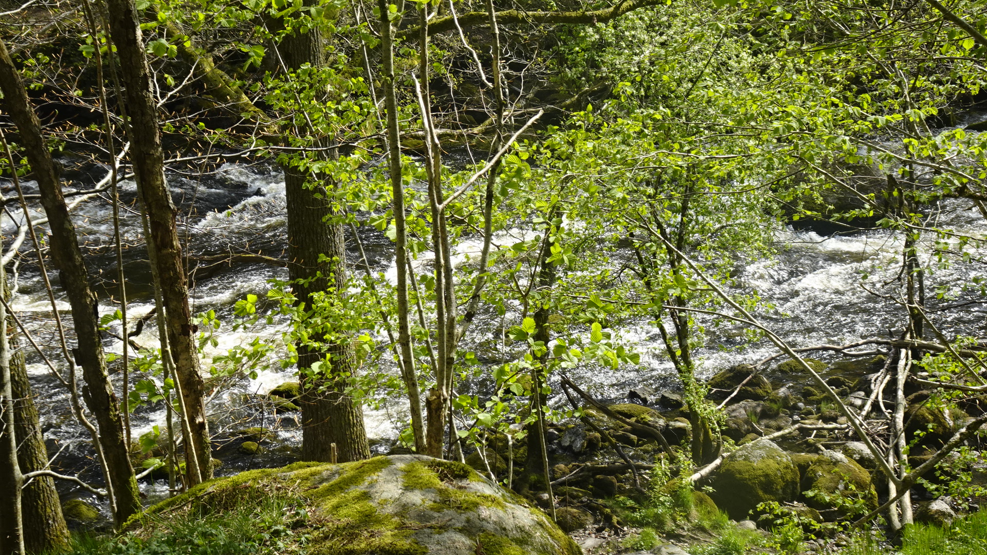 El sendero discurre entre árboles de hoja caduca, robles, alisos, sin que falten frondosas coníferas. Estas orillas son una reserva natural protegida.