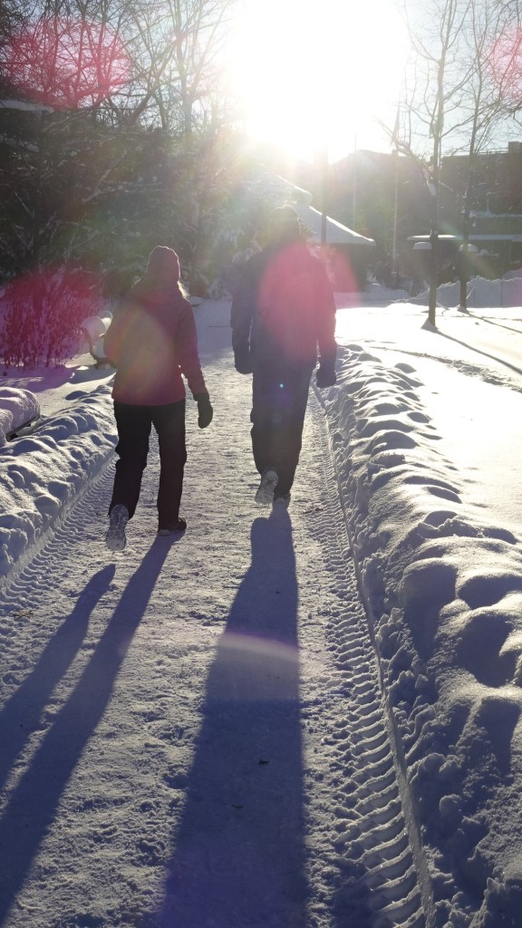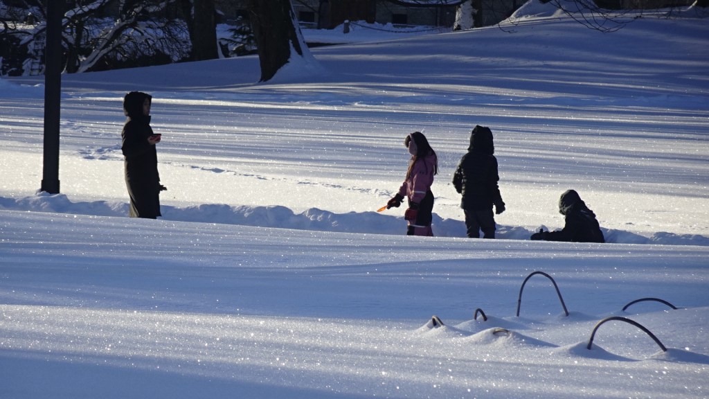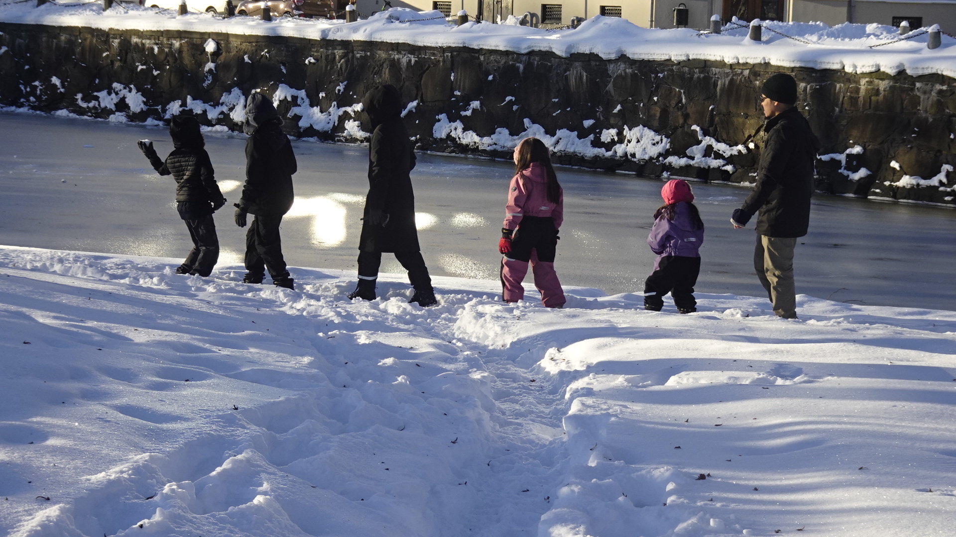 Junto al canal helado pasean las familias