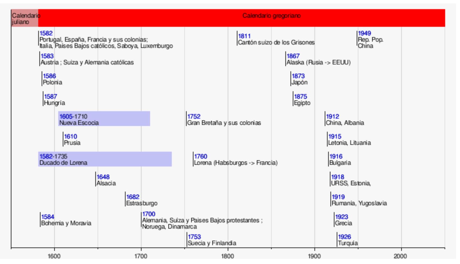 Fases de la implantación del calendario de Gregorio XIII. Fuente: Wikipedia