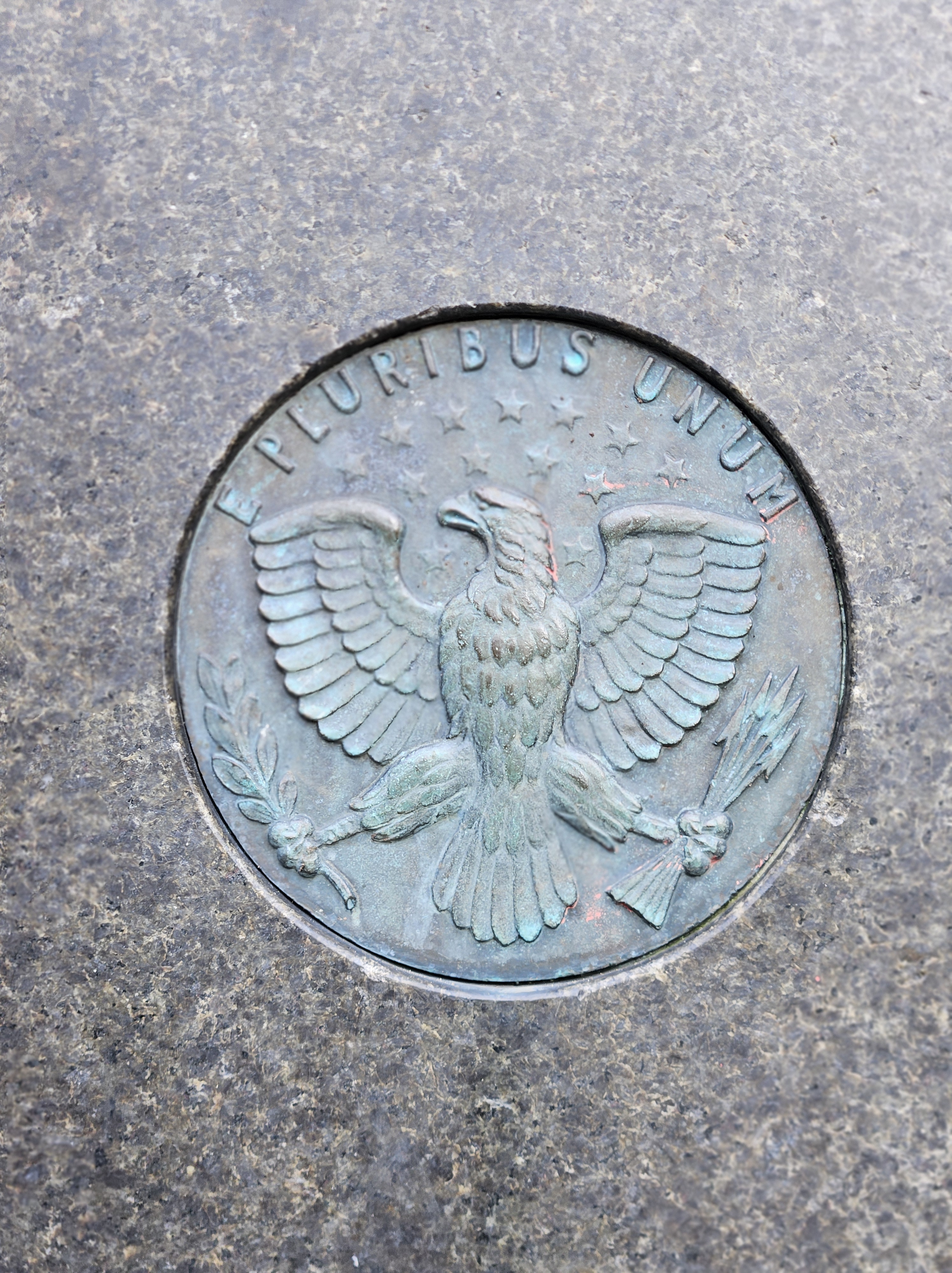 En el frontispicio del monumento figura también la simbólica corona sueca y el símbolo del águila de la revolución americana.
