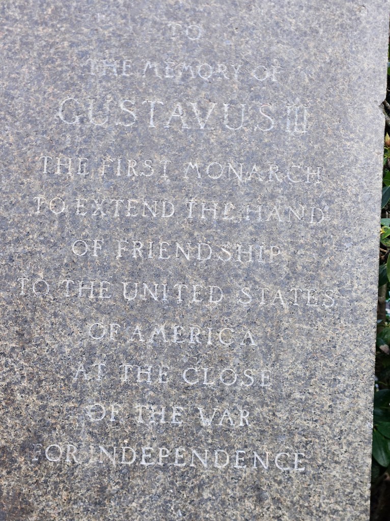 «En memoria de Gustavus III, el primer monarca que extendió la mano de la amistad a los Estados Unidos de América al final de de la Guerra de Independencia»