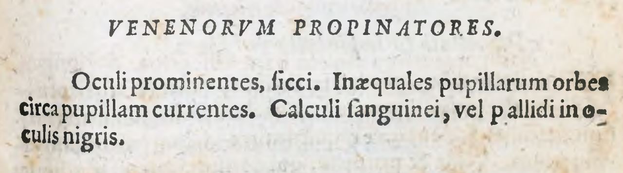 LOS DISPENSADORES DE VENENOS Ojos prominentes, falsos. Orbitas pupilares desiguales rodeando las pupilas. Granulaciones de color sangre o pálidas en unos ojos negros.