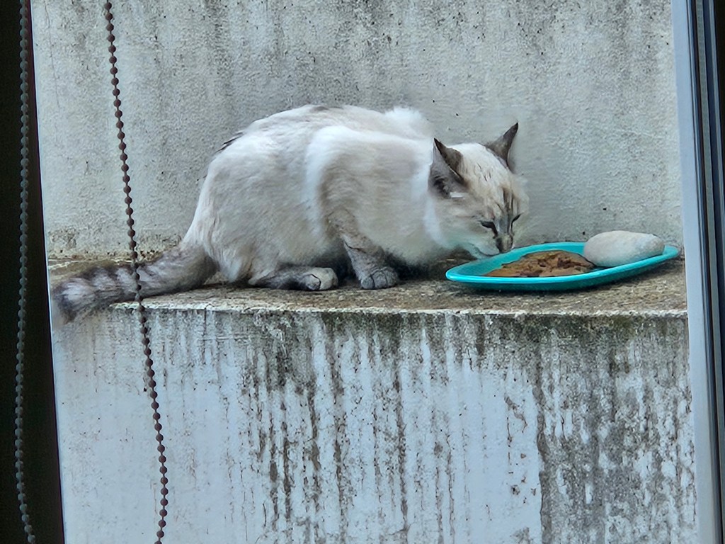 Así que nuestro amigo blanco y gris siguió beneficiándose de las pitanzas, que yo dejaba y que el venía ya atardecido a engullir satisfecho