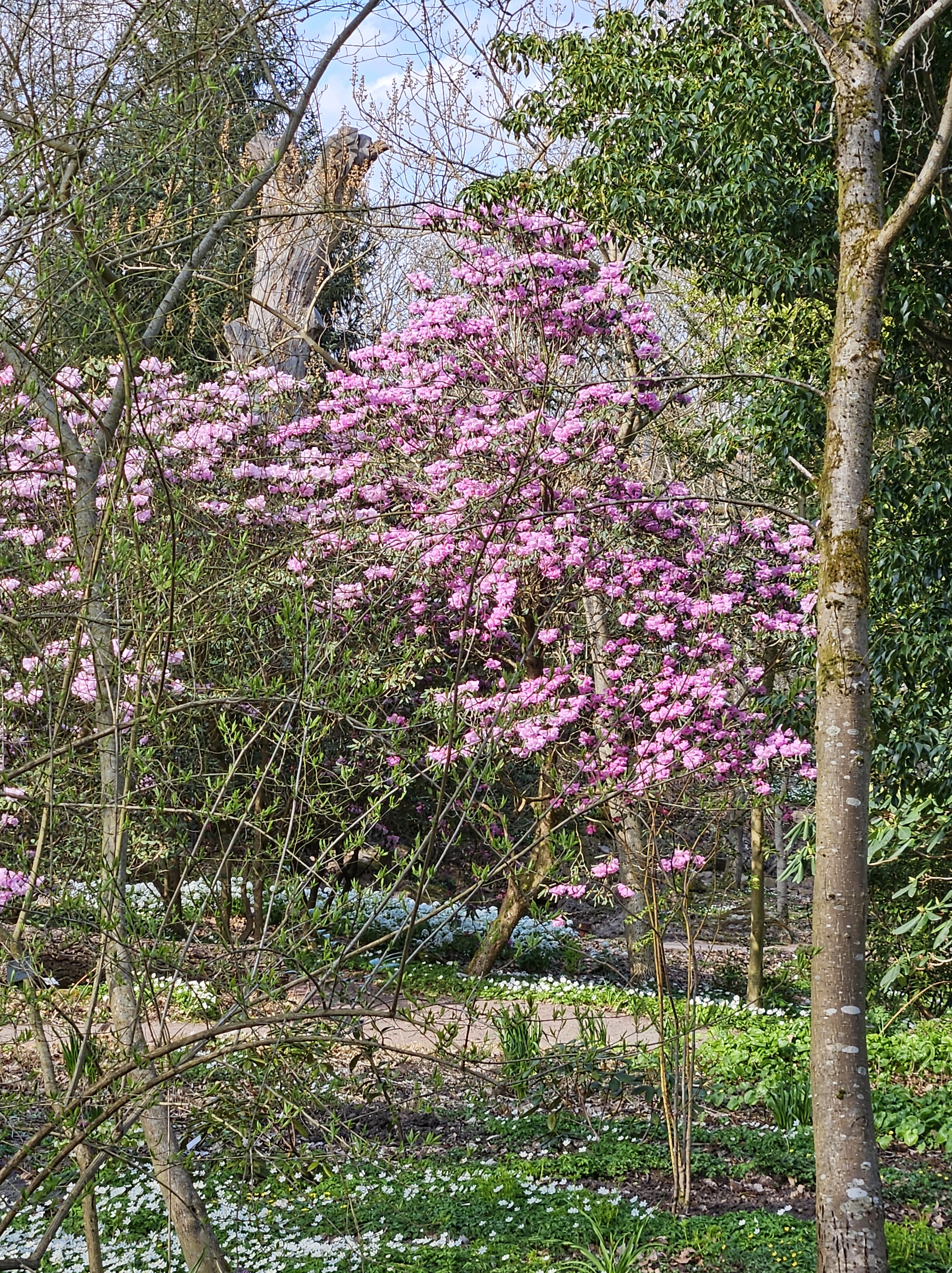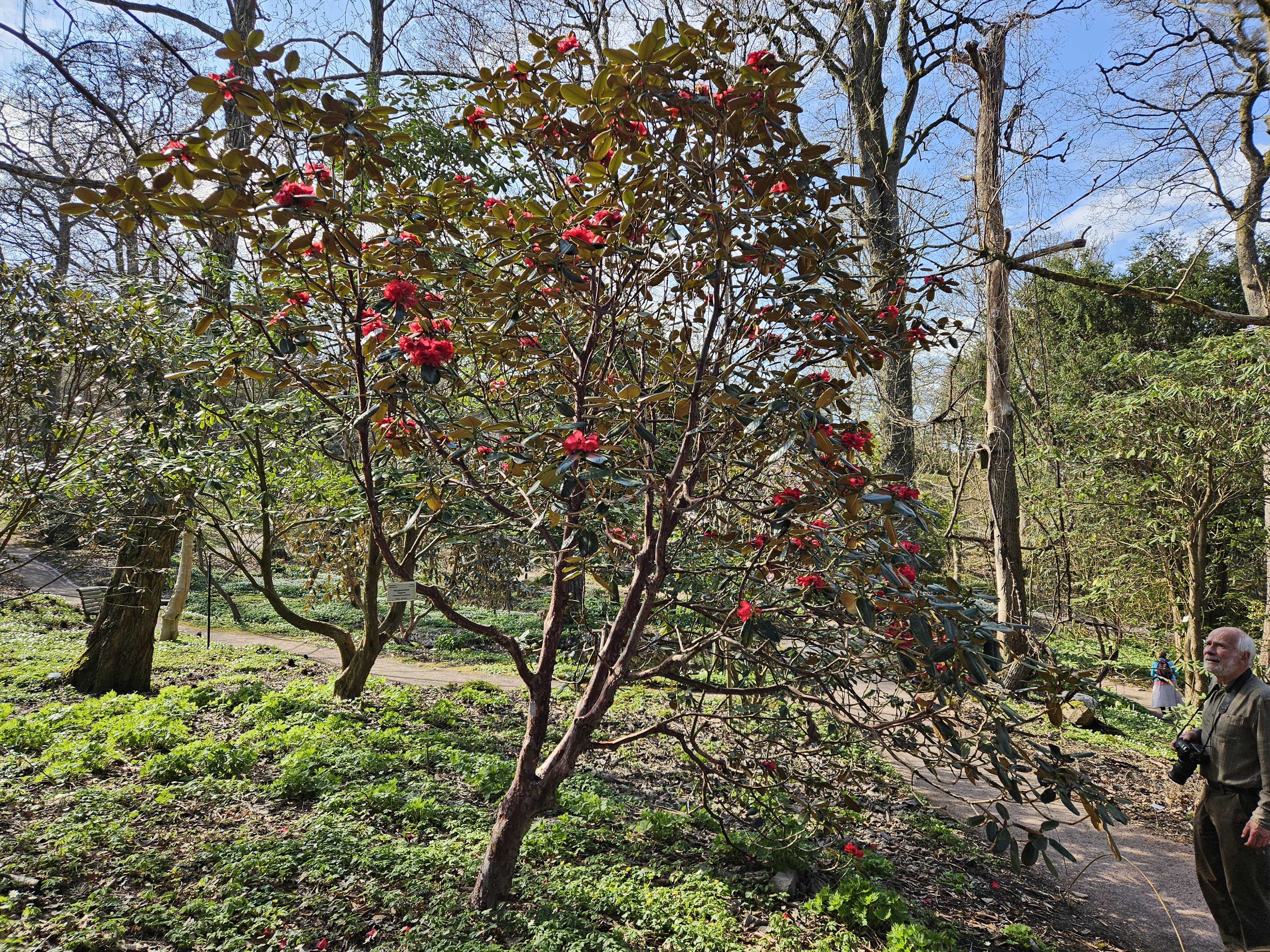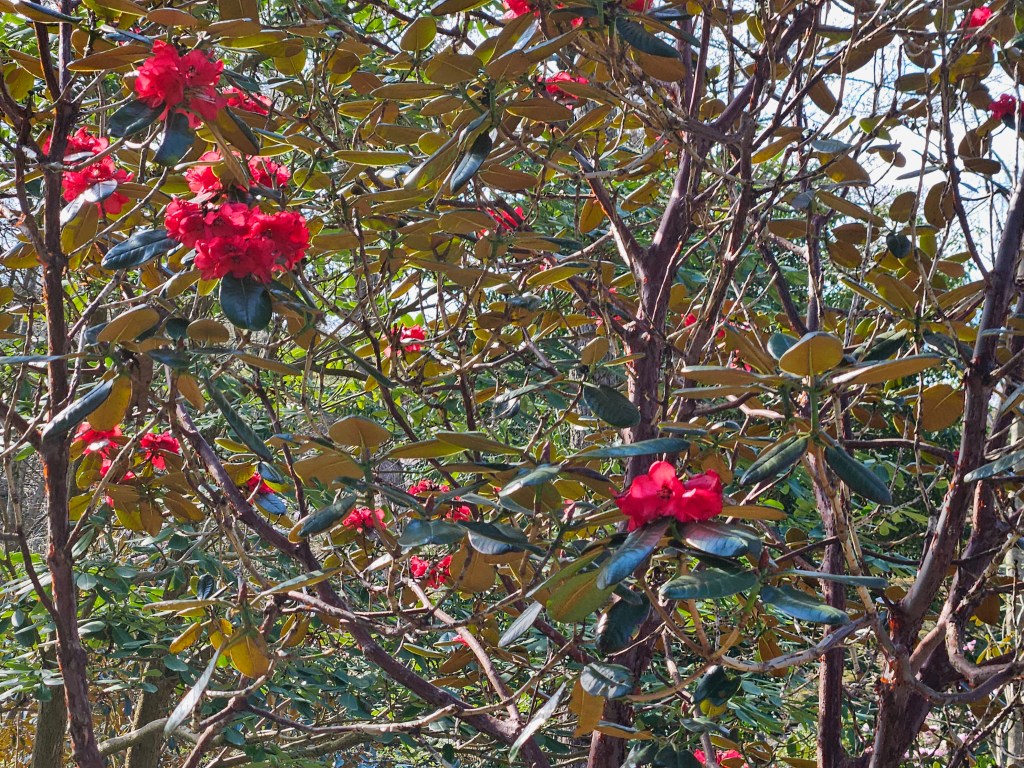 En sus alrededores nos aguardan las floraciones primaverales de diversos árboles, como un rododendro de flores rojas originario del Nepal.
