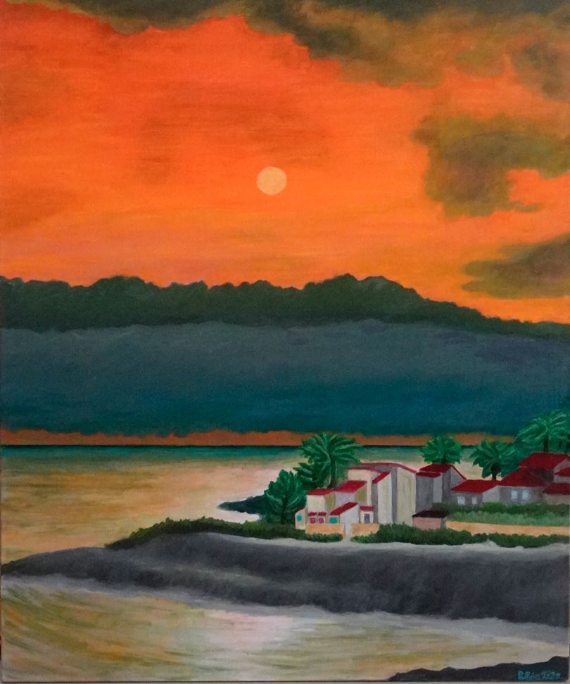 Se alza el sol en la playa. Acrílico y óleo sobre lienzo, 2024. R. Puig