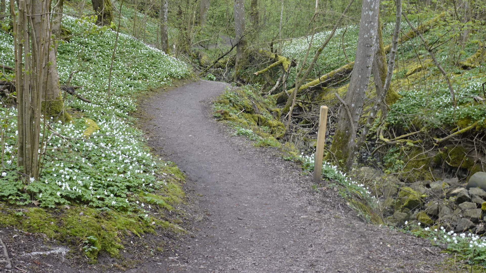 El 1º de mayo el sol y las temperaturas benignas animaban a dar un paseo, esta vez por las márgenes del Säveån, a veces calmado como un lago y otras rápido como un torrente. Partimos de la estación de tren de Floda en dirección a Lerum, tomando el sendero del Gotaleden («camino de los godos»).