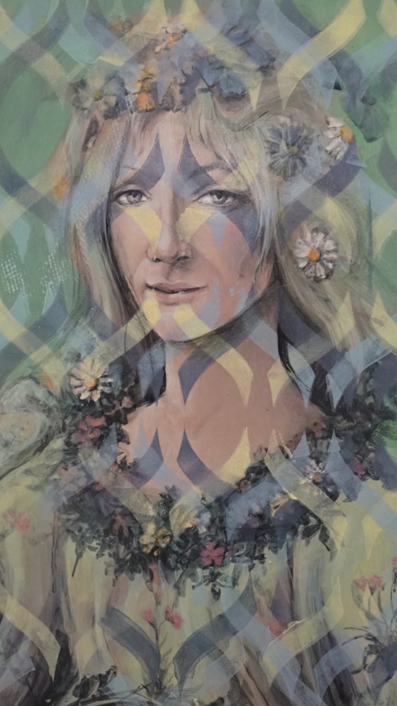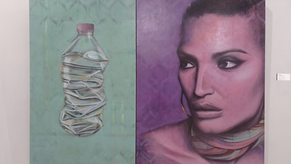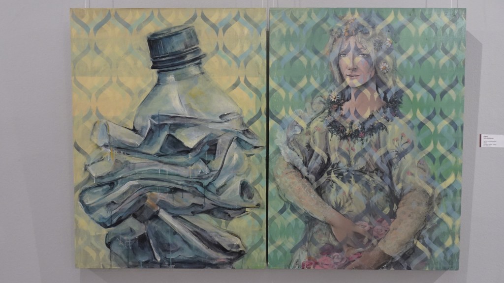 Crea así asociaciones abiertas a la intuición del espectador, que contempla la doble escena sobre la que superpone las líneas de una abstracción de inspiración cerámica sobre una mujer-primavera de rasgos botticellianos, que sostiene su vientre pleno al flanco del desecho agotado de una botella plástica.